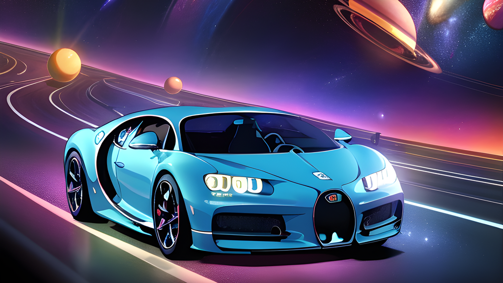 - Stunning images of a 2023 Bugatti Chiron driving on a rainbow colored road in space