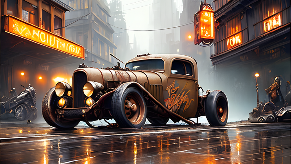 The rat rod is a unique and stylish vehicle, and it looks amazing against the backdrop of the futuristic city. The images are full of detail, and they capture the beauty and wonder of the future in stunning detail. Whether you're a car enthusiast or just looking for a unique piece of art to add to your home, these images are sure to impress.